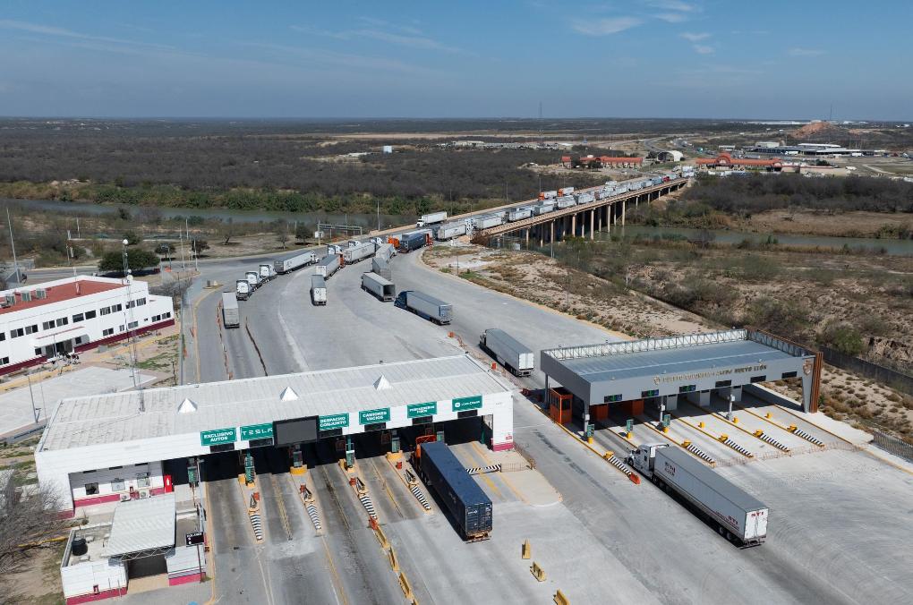 2月15日,在墨西哥新莱昂州哥伦比亚镇,货车通过一处边检站后,准备从国际桥跨越格兰德河进入美国。新华社记者李梦馨摄