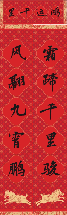 春联诗句撷取自诗圣杜甫《赠特进汝阳王二十韵》,以千里骏马、九霄鹏鸟为喻,寄予前程远大、凌云万里的宏伟气魄,是马年新春的绝佳注脚。采用宋代书法大家黄庭坚字体入联,笔力遒劲,气韵生动。
