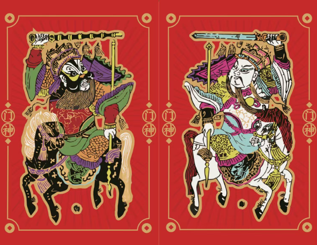 门神形象设计借自清代陕西凤翔“马上秦琼尉迟恭”年画原版(现藏于重庆中国三峡博物馆),武将骑马,英姿勃发,更添“一马当先”的守护之力。