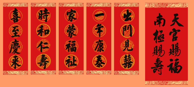 精选清雍正御笔“一年康泰”“出门见喜”等吉语春条,以及行书春条“天官赐福南极赐寿”,同时搭配清代“喜至庆来”“时和人寿”等经典春条,字里行间,尽显皇家福瑞。