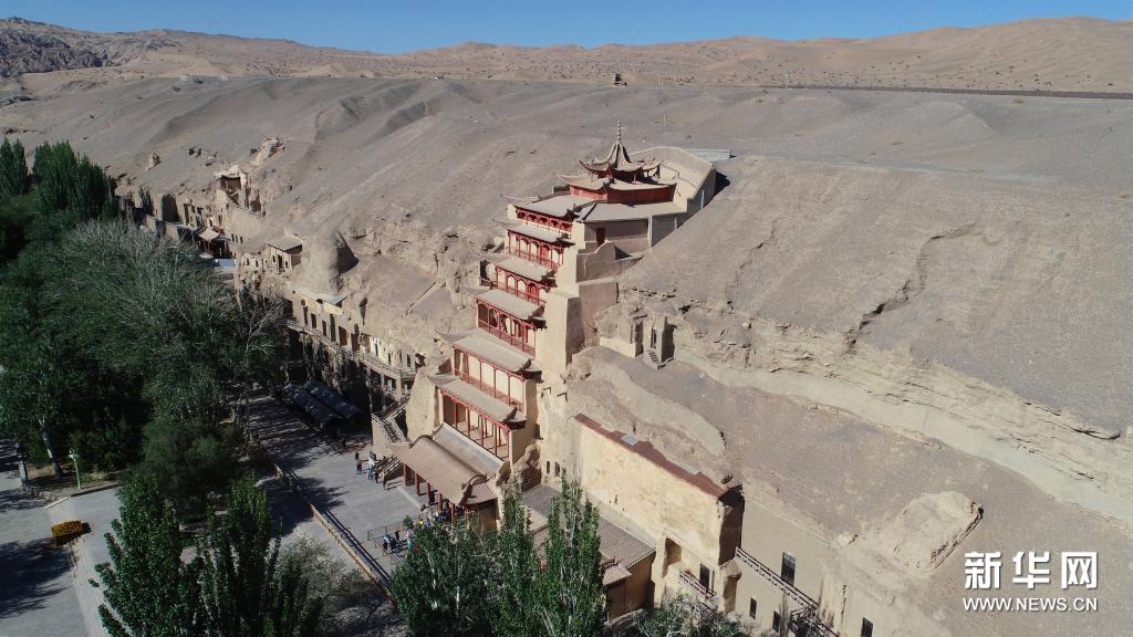 游客在敦煌莫高窟游覽(7月6日攝,無(wú)人機(jī)照片)。新華社記者 劉詩(shī)平 攝