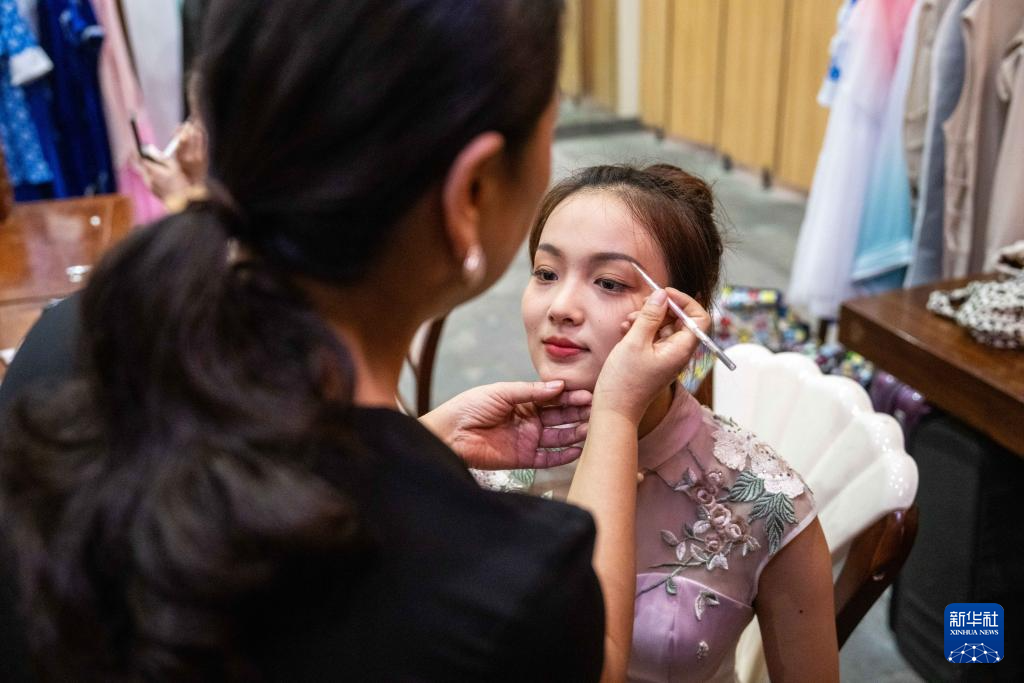 9月3日,在常德河街,国家级非遗项目常德丝弦的演员在演出前化妆。