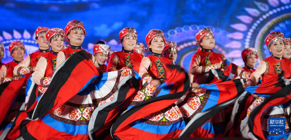 9月28日,农民广场舞表演队在山东省邹平市迎国庆群众广场舞大赛上表演。