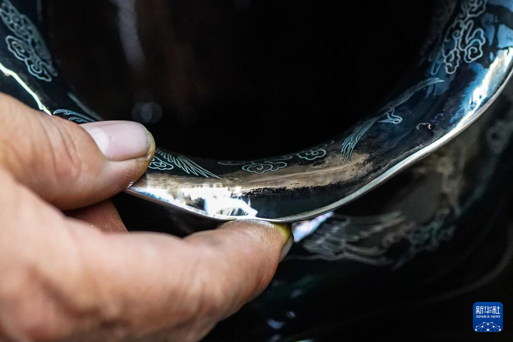 10月25日,在昆明乌铜走银传习馆,弟子在金永才指导下进行细打磨作业。