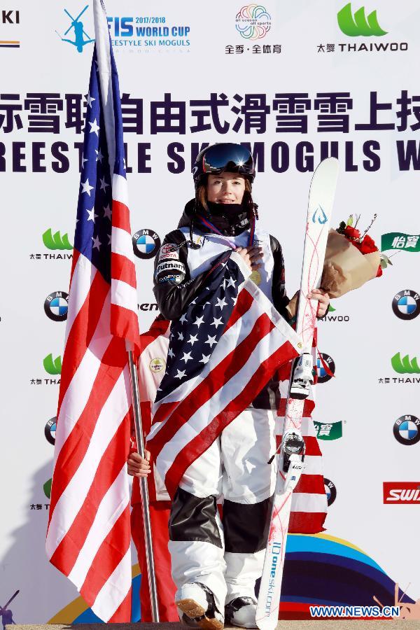 Winner Jaelin Kauf of the United States celebrates on the podium after winning the ladies' Moguls on the Day 1 of the 2017-2018 Freestyle Skiing World Cup-Moguls & Aerials at the Thaiwoo ski resort in Chongli District of Zhangjiakou City, north China's Hebei Province, Dec.21, 2017. (Xinhua/Meng Jing)