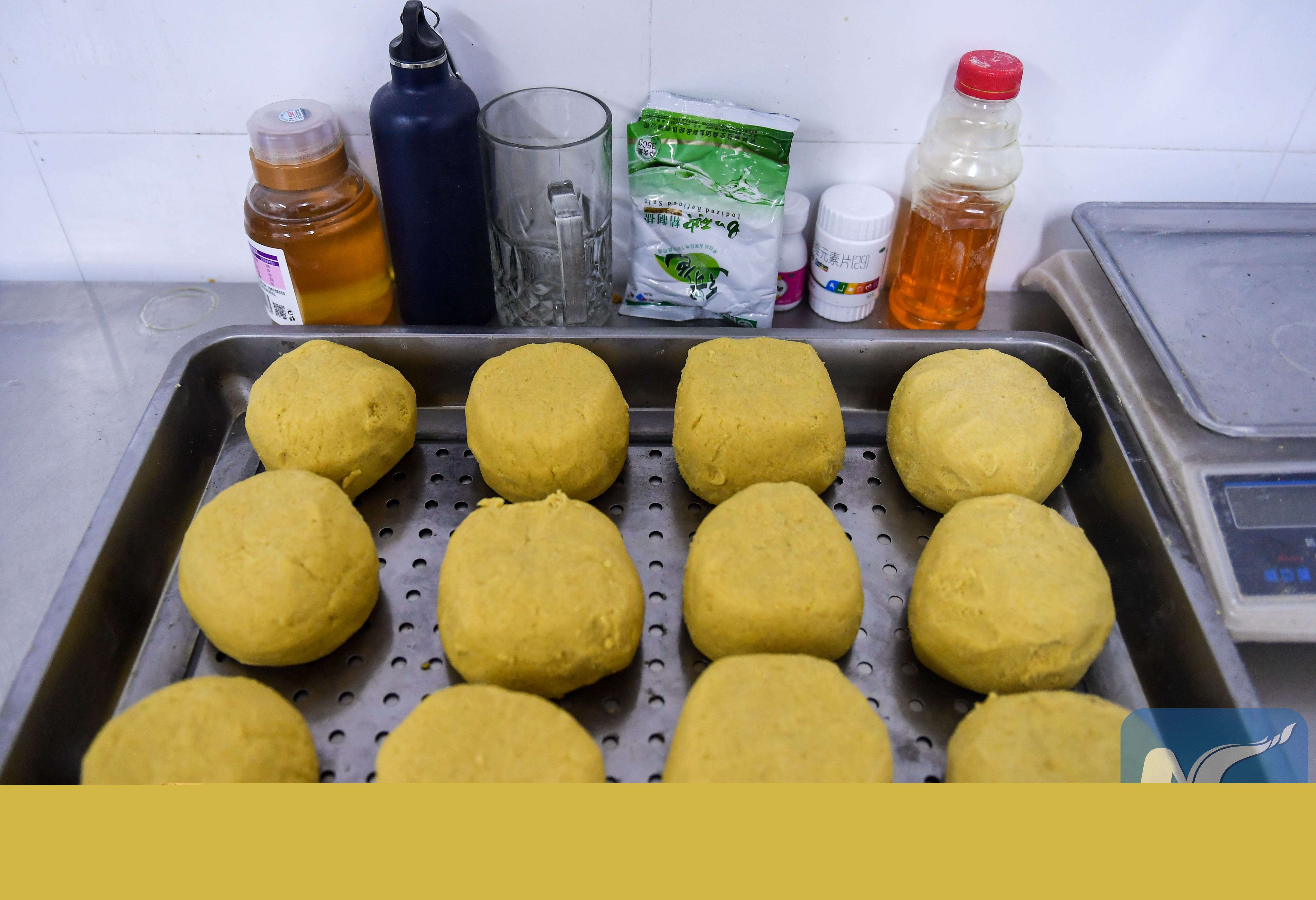 Wotou, a snack made with egg, corn, soy bean, rice, oat and vitamins, is one of the favorite food for the panda pair.(XINHUA/Shao Meiqi)