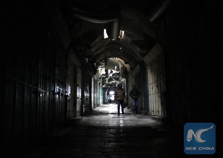People walk past closed shops in Jerusalem's Old City, on Jan. 23, 2018. Palestinians called for a general strike protesting against the visit of U.S. Vice President Mike Pence in Jerusalem. (Xinhua/Muammar Awad)