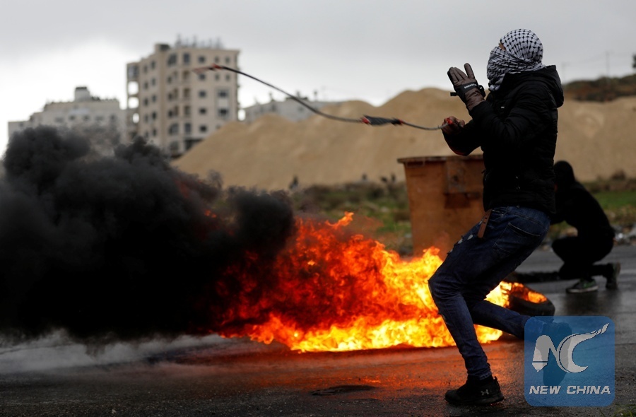 A Palestinian demonstrator uses a sling to hurl stones at Israeli troops at a protest against the visit of U.S. Vice President Mike Pence in Jerusalem, near the West Bank city of Ramallah January 23, 2018. (Xinhua/REUTERS)