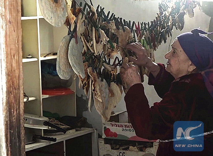 Hijjo, 90, dries up the leftover bread pitas collected from other residents in the Shati refugee camp in Gaza Strip on March 7, 2018. She earns her own living by selling the pitas to livestock owners. (Xinhua Photo)