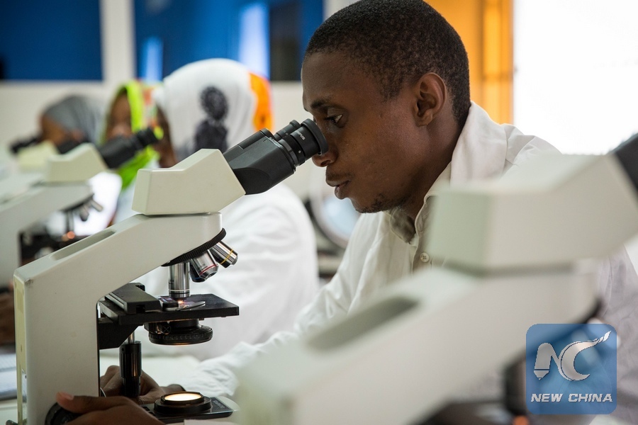 A local technician looks for malaria parasites in a lab inside Comoros' anti-malaria center, April 17, 2018. (Xinhua/Lyu Shuai)