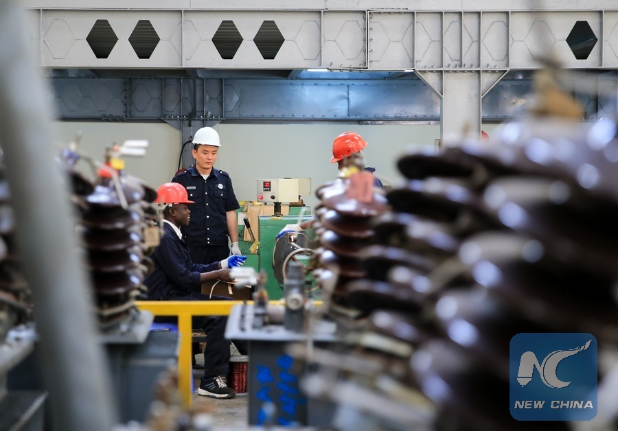 A Chinese engineer guides Kenyan technicians to work at Yocean manufacturing transformers factory on the outskirts of Nairobi, Kenya, on Oct. 5, 2016. Kenya's first transfomer-manufacturing plant, set up by Chinese company Yocean Group, opened on Wednesday. Kenya has been relying on transformers from abroad, mostly from India. Kenya's Cabinet Secretary for Energy and Petroleum, Charles Keter, said the plant will ease procurement of transformers and other electrical appliances. (Xinhua/Pan Siwei)