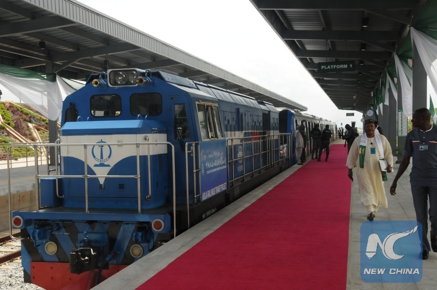 The president and co-passengers, including Zhou Pingjian, the Chinese ambassador in Nigeria, rode on the train to the Abuja Airport Terminal at the capital city's Nnamdi Azikwe International Airport.