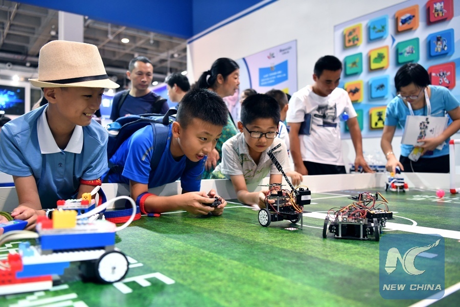 Children look at programming robots at World Robot Conference 2018 in Beijing, capital of China, Aug. 15, 2018. Kicking off on Wednesday, the conference attracted more than 160 domestic and international corporations exhibiting their cutting-edge products in the robotics industry. (Xinhua/Li Xin)