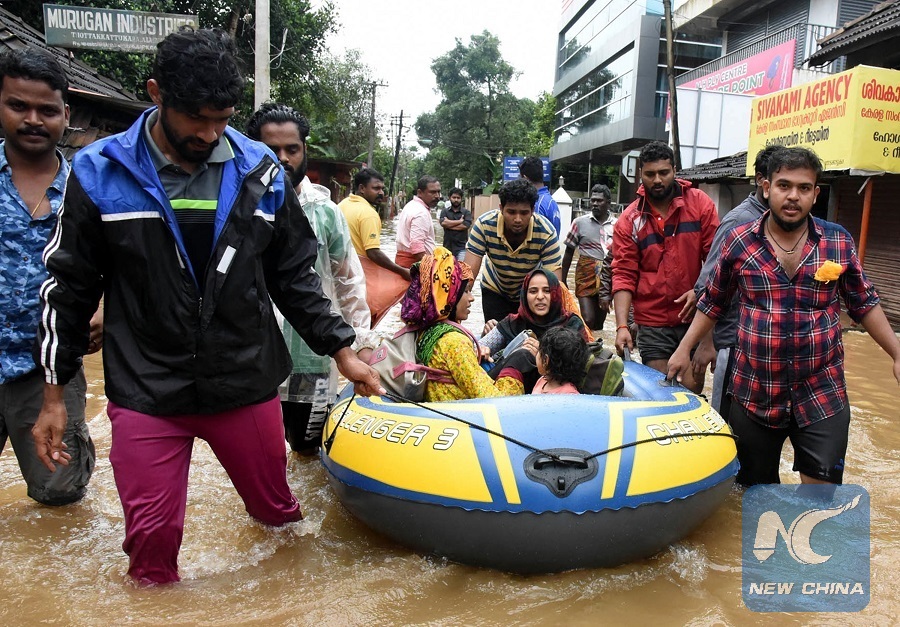 CHENGANNUR, India, Aug. 22 (Xinhua) -- On India's Independence Day on Aug. 15, people were still asleep in the coastal parts of the southernmost state of Kerala when suddenly water started gushing into their homes. Within minutes, before people could realize what was in store for them, their homes were inundated with water-level reaching up to 2.4 meters.