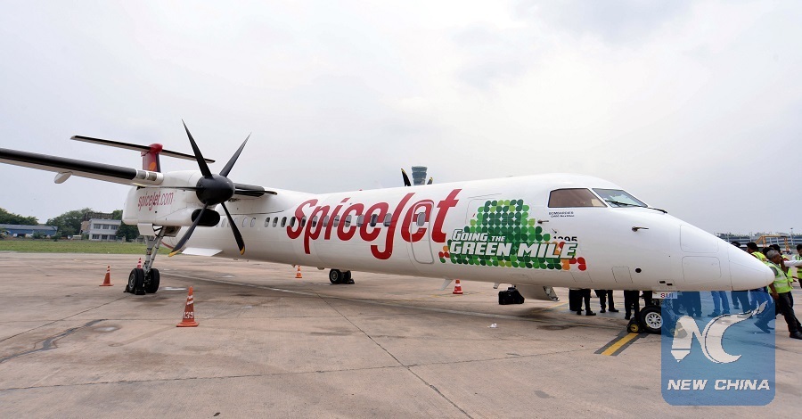 The 72-seater Bombardier Q400 turboprop aircraft, powered by a mix of biofuel and air turbine fuel, is seen at Delhi Airport in New Delhi, India, Aug. 27, 2018. (Xinhua/Partha Sarkar)