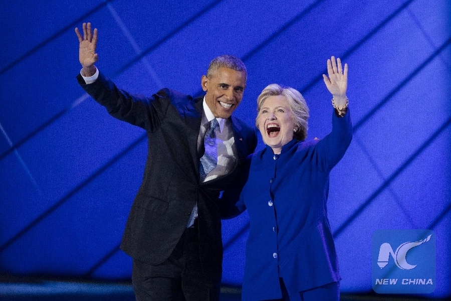 File Photo: U.S. Democratic Presidential Candidate Hillary Clinton (R) and U.S. President Barack Obama are pictured on the third day of the 2016 Democratic National Convention in Philadelphia, Pennsylvania, the United States, July 27, 2016. (Xinhua/Li Muzi)