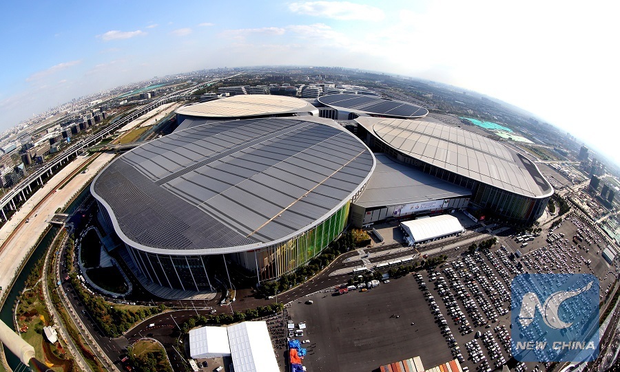 Aerial photo taken on Oct. 19, 2018 shows the National Exhibition and Convention Center (Shanghai), the main venue to held the upcoming first China International Import Expo (CIIE), scheduled to be held from Nov. 5 to 10, in Shanghai, east China. (Xinhua/Fan Jun)