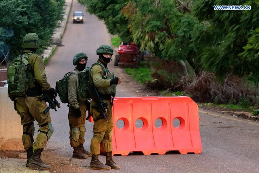 Israeli soldiers stand guard at a security checkpoint close to the border with Lebanon, near the northern Israeli town of Metula, on Dec. 5, 2018. Israeli Prime Minister Benjamin Netanyahu spoke Wednesday over the telephone with UN Secretary-General, Antonio Guterres, about Israel's operation to locate and destroy cross-border tunnels dug by Lebanon-based Hezbollah militia. The Israel Defense Forces (IDF) launched earlier Tuesday an open-ended operation to locate and destroy the Hezbollah-built tunnels crossing from southern Lebanon into northern Israel. (Xinhua/JINI/Ayal Margolin)