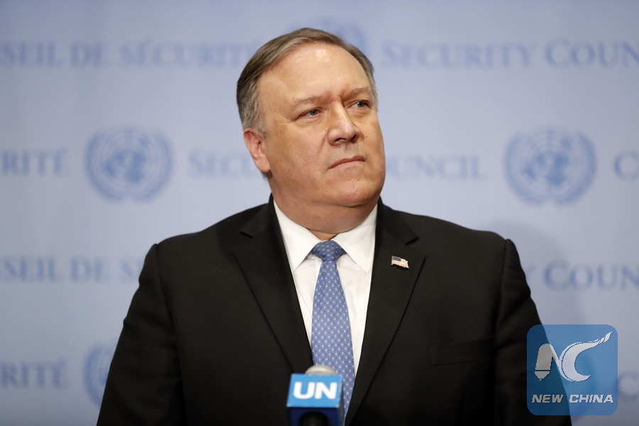 U.S. Secretary of State Mike Pompeo speaks to reporters after a Security Council meeting on non-proliferation at the United Nations headquarters in New York, Dec. 12, 2018. (Xinhua/Li Muzi)