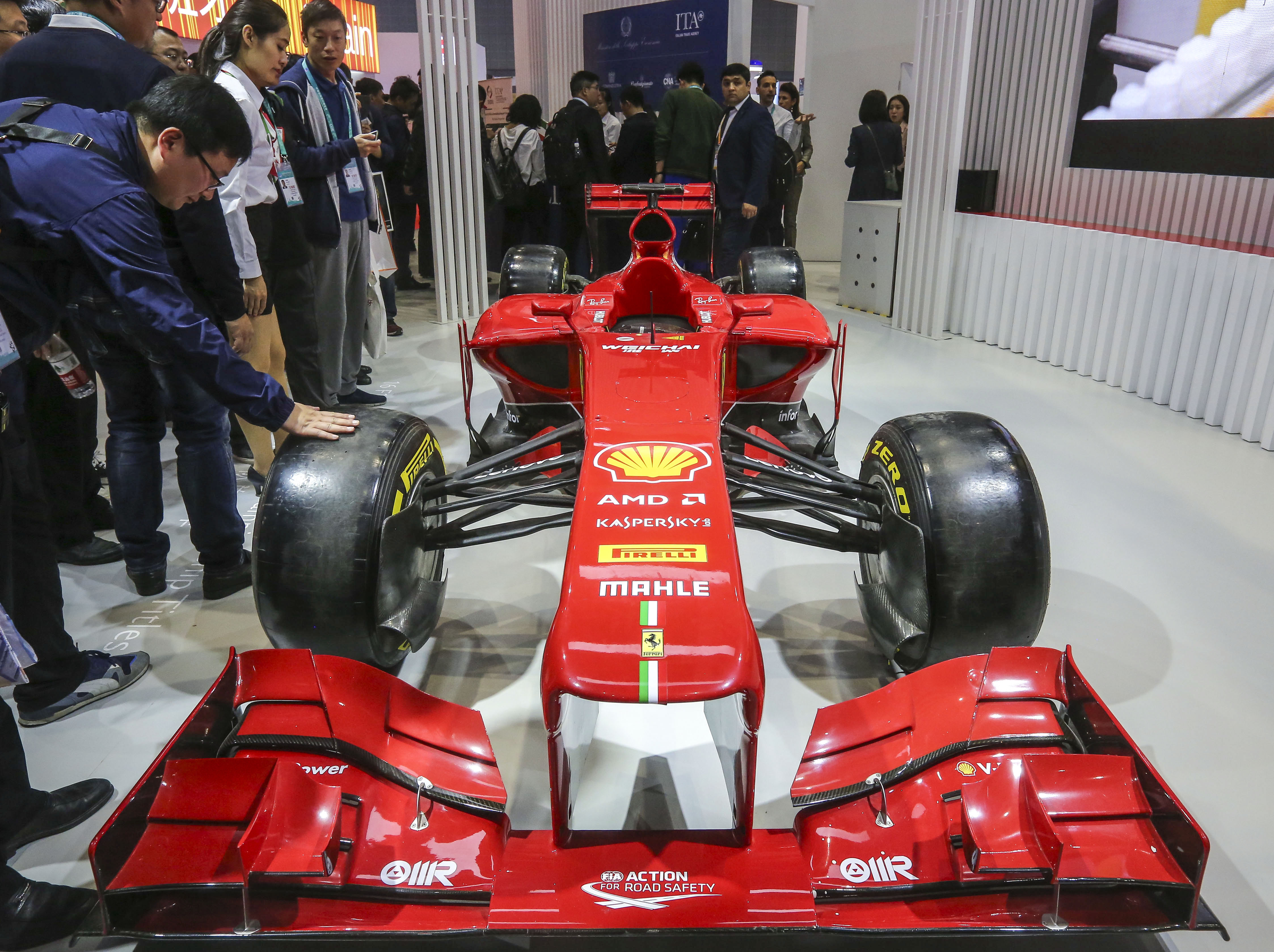 People watch a model of F1 formula racing car at the Italy booth during the first China International Import Expo (CIIE) in Shanghai, east China, Nov. 6, 2018. (Xinhua/Yin Gang)