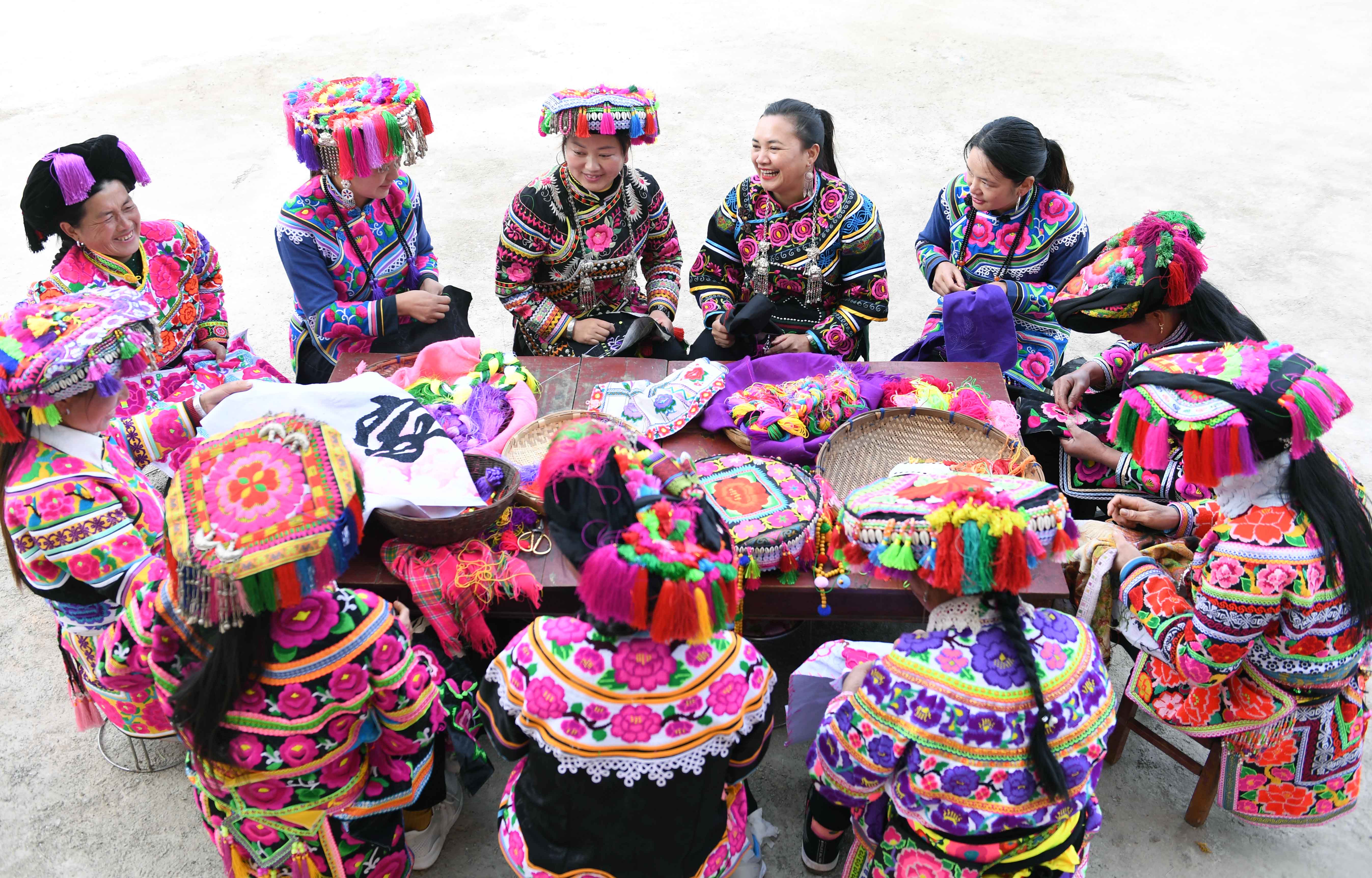 Li Changzheng (2nd R back) exchanges embroidery skills with villagers at Shuwula Village of Dayao County, Chuxiong Yi Autonomous Prefecture, southwest China's Yunnan Province, March 25, 2019. Li established a clothing company featuring embroidery of Yi ethnic group in 2008, helping about 2,000 women increase their income. (Xinhua/Yang Zongyou)