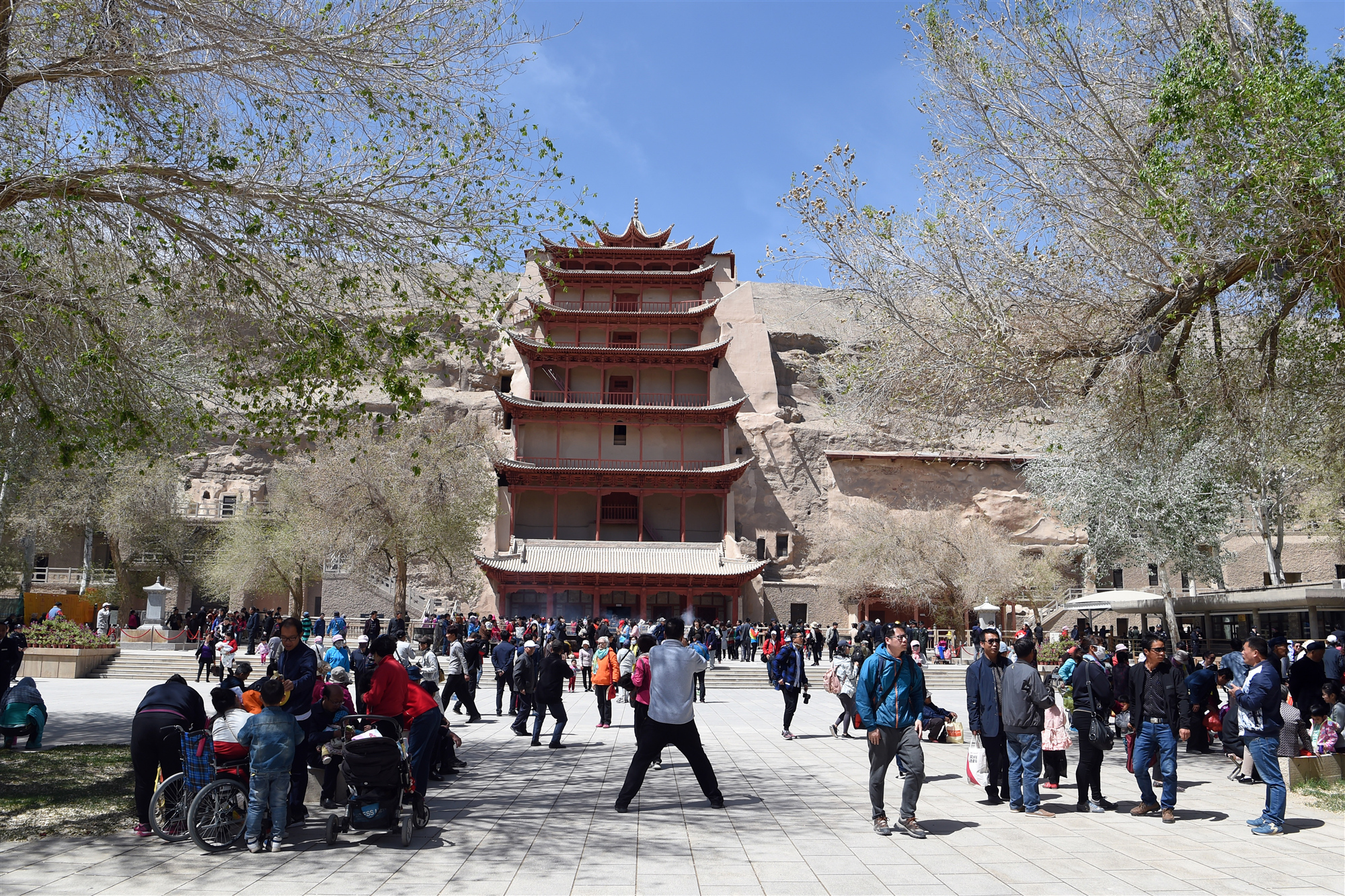 People visit the Mogao Grottoes, home to a huge collection of Buddhist artworks, in Dunhuang, northwest China's Gansu Province, May 3, 2017. (Xinhua/Chen Bin)