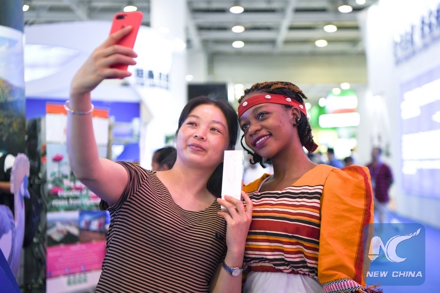 A visitor takes selfies with a staff member at the booth of Uganda during the China-Africa Economic and Trade Expo in Changsha, central China's Hunan Province, June 28, 2019. The exhibition hall of the expo opened to public on Friday and Saturday. (Xinhua/Xue Yuge)