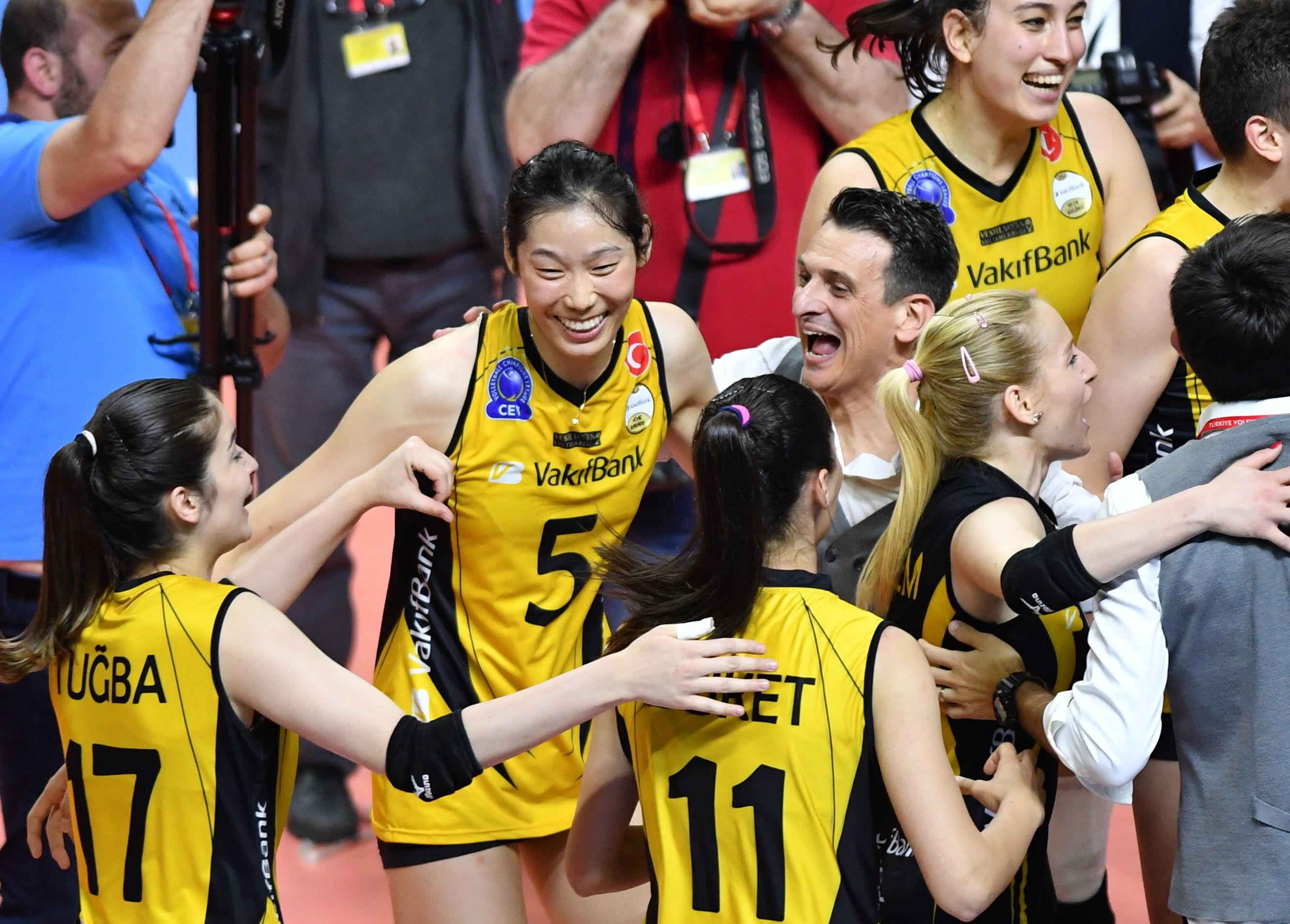 Zhu Ting (2nd L) of Vakifbank celebrates with teammates after the 2018-2019 season Turkish Women's Volleyball Super League final fifth round match between Vakifbank and Eczacibsi on May 5, 2019. Vakifbank won 3-0 and claimed the title with total score of 3-2. (Xinhua/Xu Suhui)