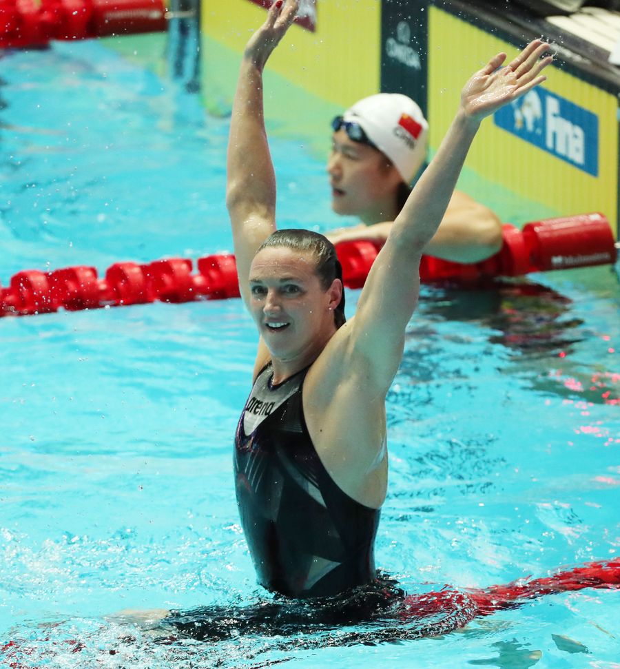 Gold medalist Katinka Hosszu (Front) of Hungary celebrates after the women's 400m medley final at the Gwangju 2019 FINA World Championships in Gwangju, South Korea, on July 28, 2019. (Xinhua/Li Gang)