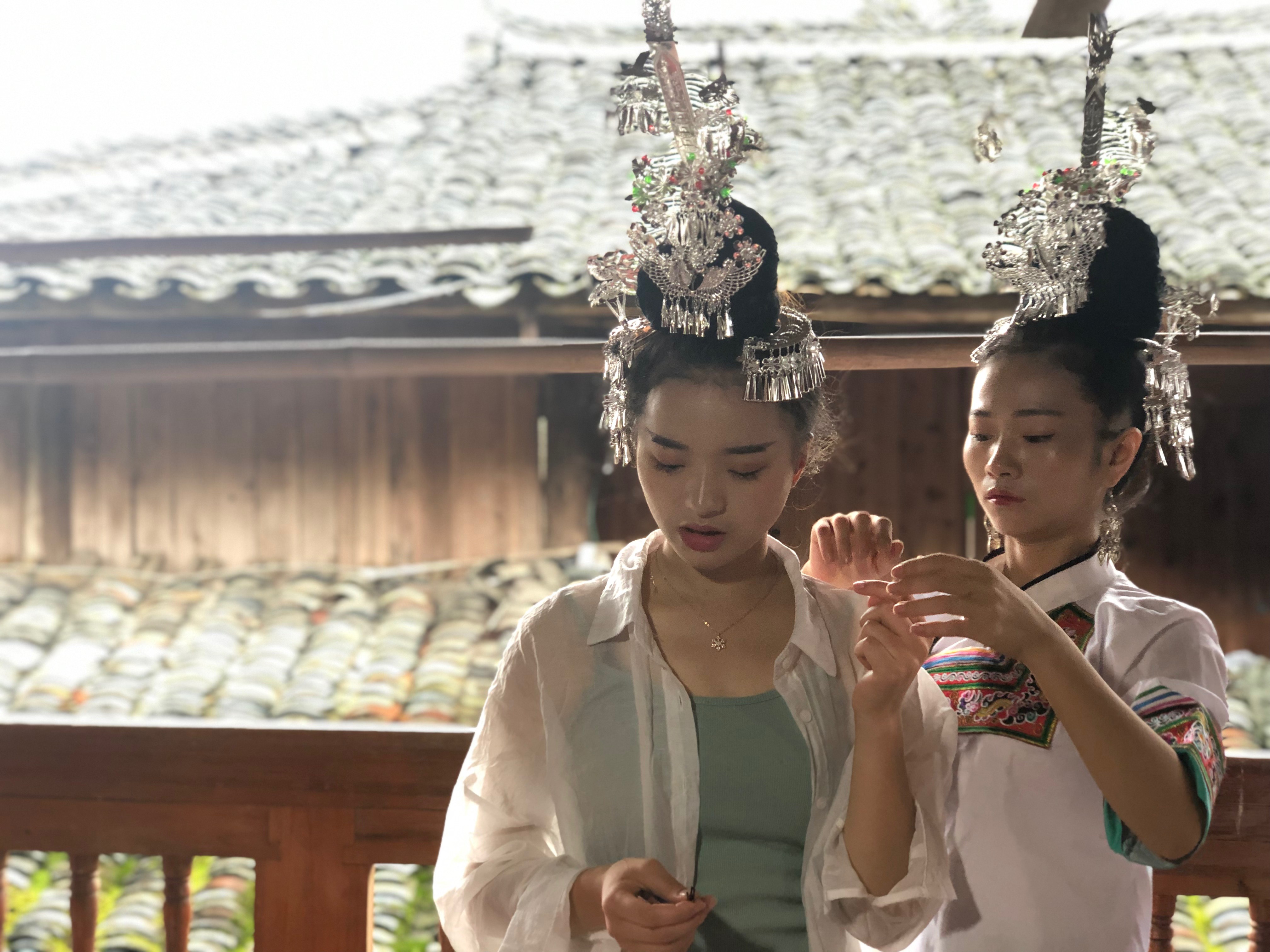 Members of the "Seven Dong Fairies" make up in Gaibao Village of Liping County, southwest China's Guizhou Province, July, 12, 2019. (Xinhua/Liu Zhiqiang)