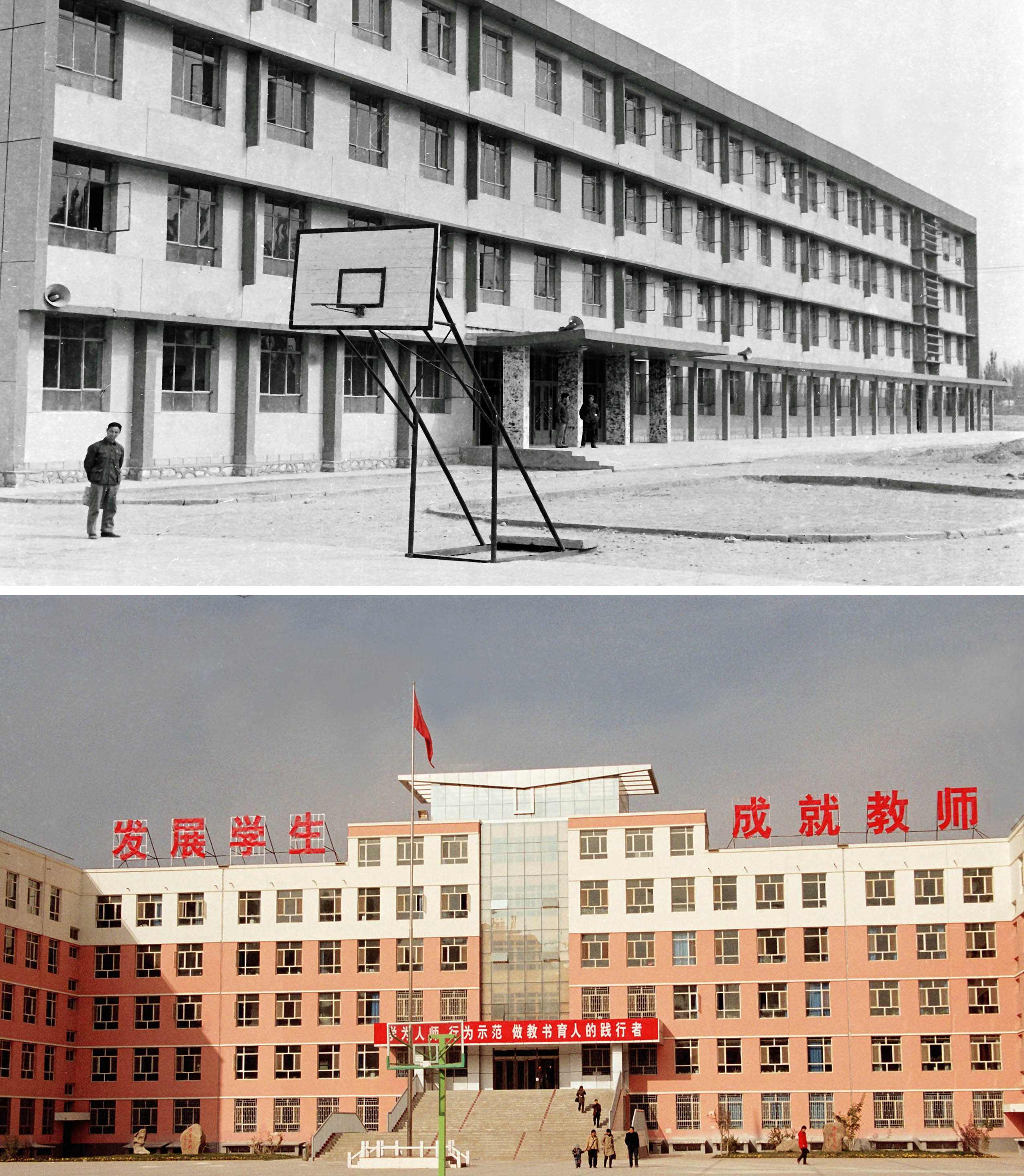 Combo photo taken by Li Hanchao shows views of the No.2 Middle School of Bayingol Mongolian Autonomous Prefecture in Korla, NW China's Xinjiang Uygur Autonomous Region, in 1989 (up) and in 2008. (Xinhua)