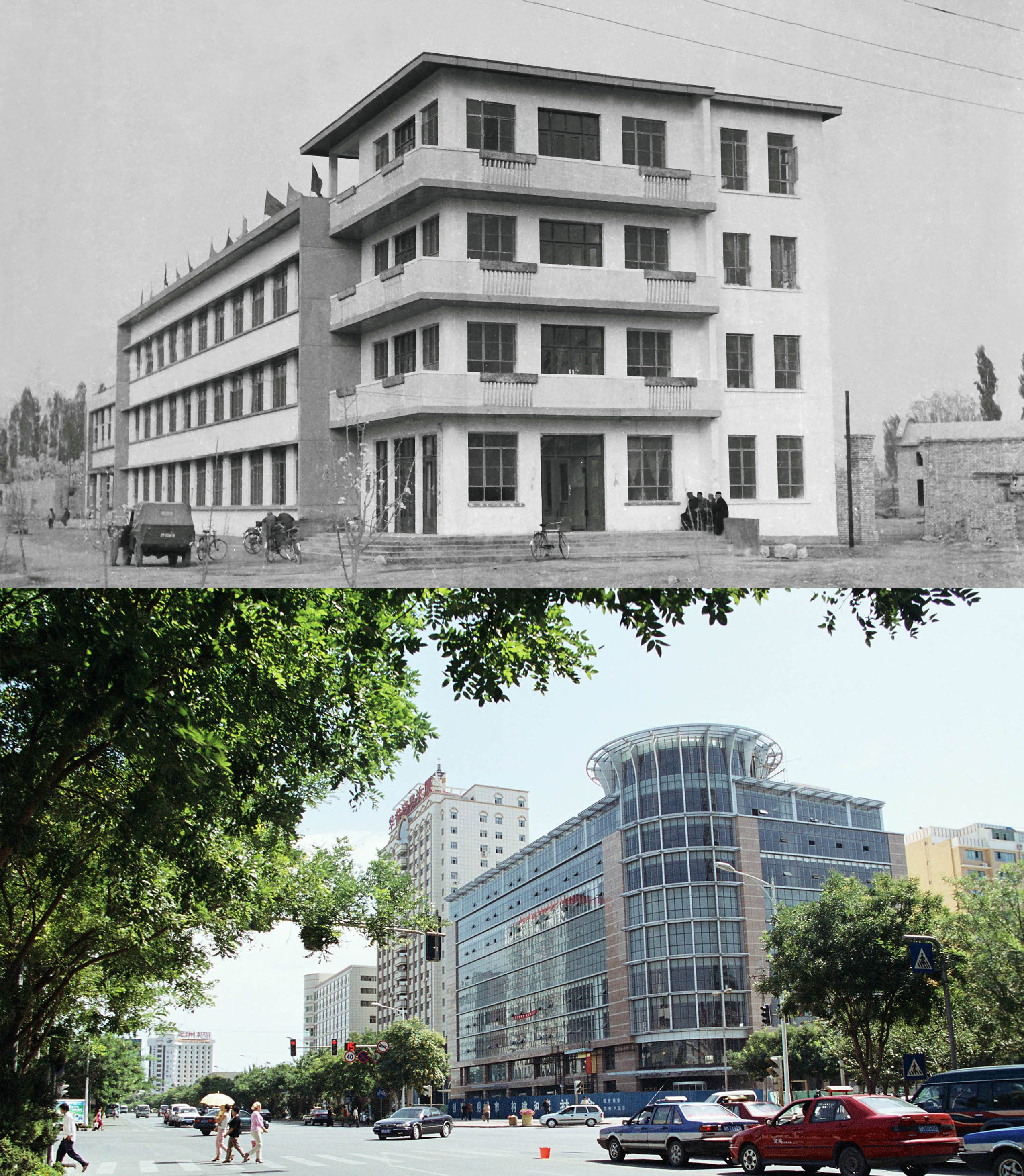 Combo photo taken by Li Hanchao shows a view of the Lixiang Hotel (up) in 1989 and a view of a commercial building built on the site of the Lixiang Hotel in 2006, in Korla, NW China's Xinjiang Uygur Autonomous Region. (Xinhua)