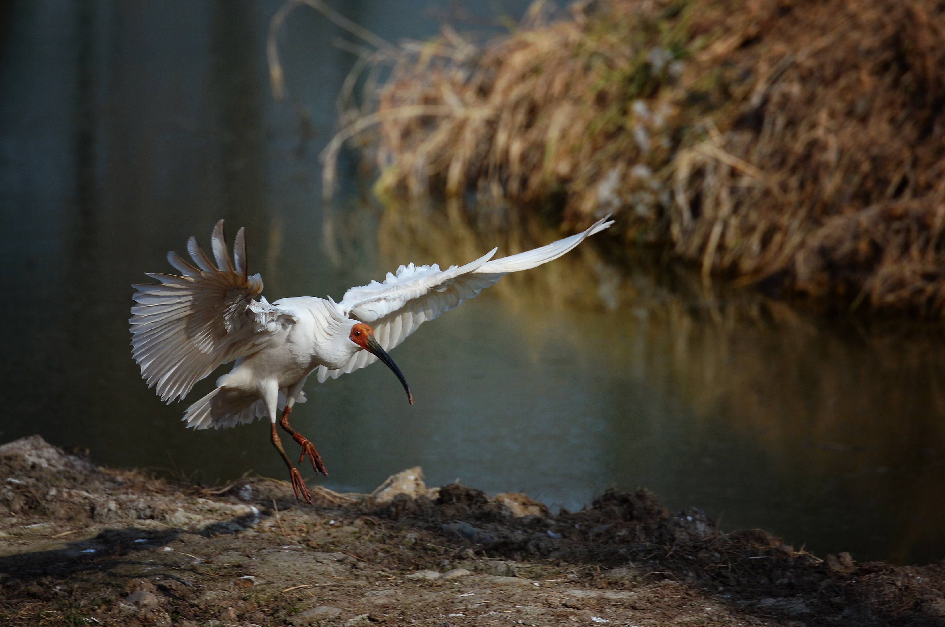 A crested ibis prepares to fly at the Yangxian crested ibis ecological park in Yangxian County, Jan. 19, 2018. (Xinhua/Liu Xiao)