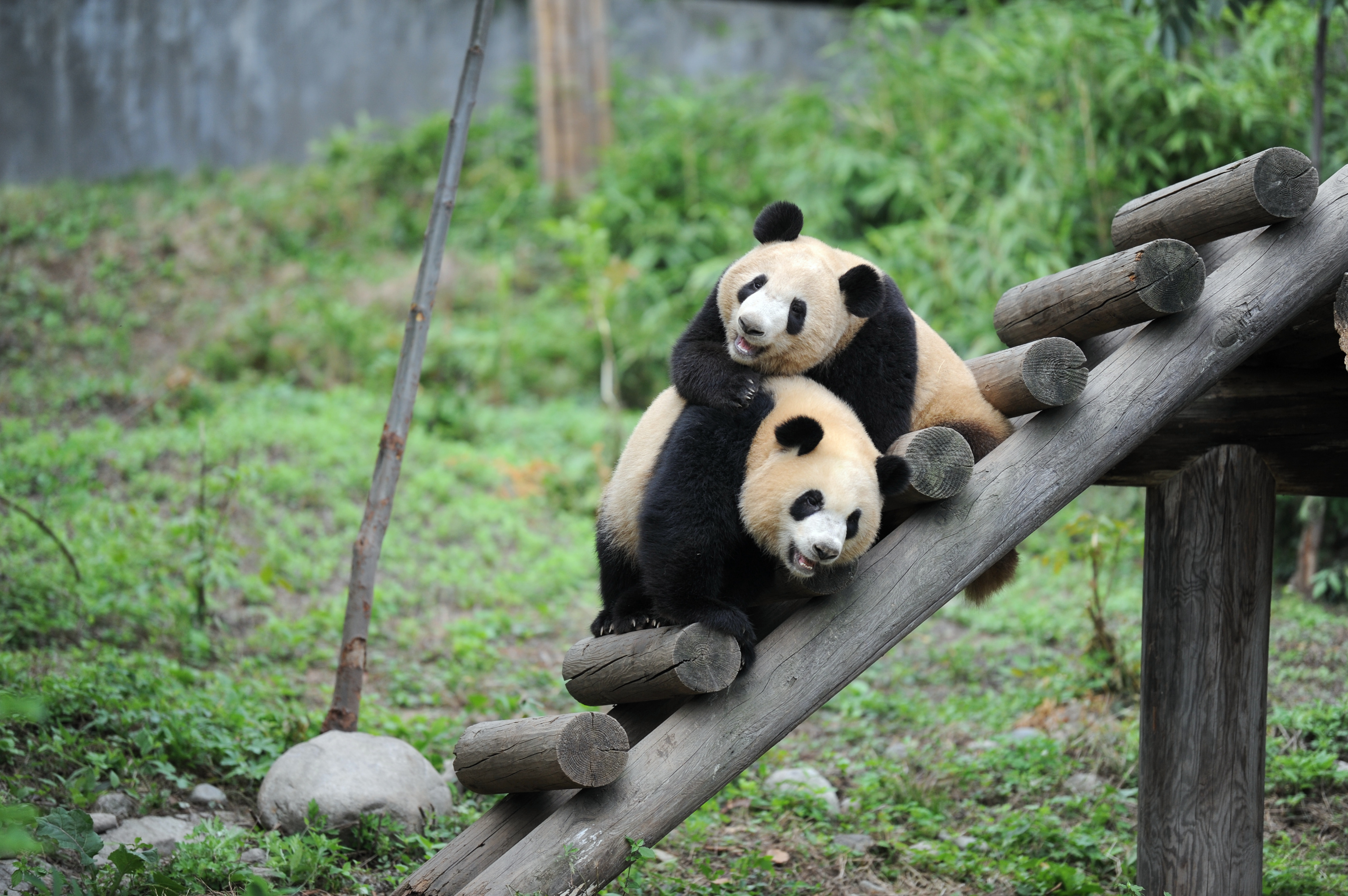 Giant panda cubs Lu Lu (L) and Qiang Sheng play at the Shaanxi Rare Wild Animals Rescue and Breeding Research Center, Sept. 7, 2018. (Xinhua/Zhang Bowen)
