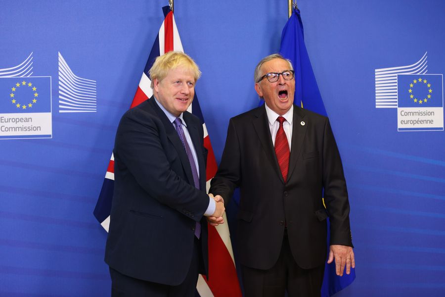 British Prime Minister Boris Johnson (L) and European Commission President Jean-Claude Juncker shake hands as they meet the press during an EU summit in Brussels, Belgium, Oct. 17, 2019. (Xinhua/Zheng Huansong)