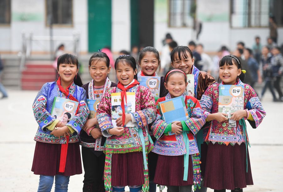 File photo taken on Nov. 29, 2017 shows girls posing for photo at a school in Baiyun Township in Rongshui Miao Autonomous County, south China's Guangxi Zhuang Autonomous Region. (Xinhua photo)