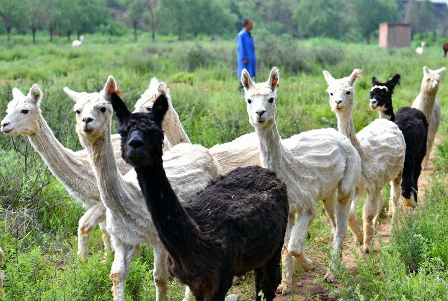 Alpacas graze on the hill in Yangqu County of north China's Shanxi Province, on July 14, 2018. (Xinhua/Cao Yang)