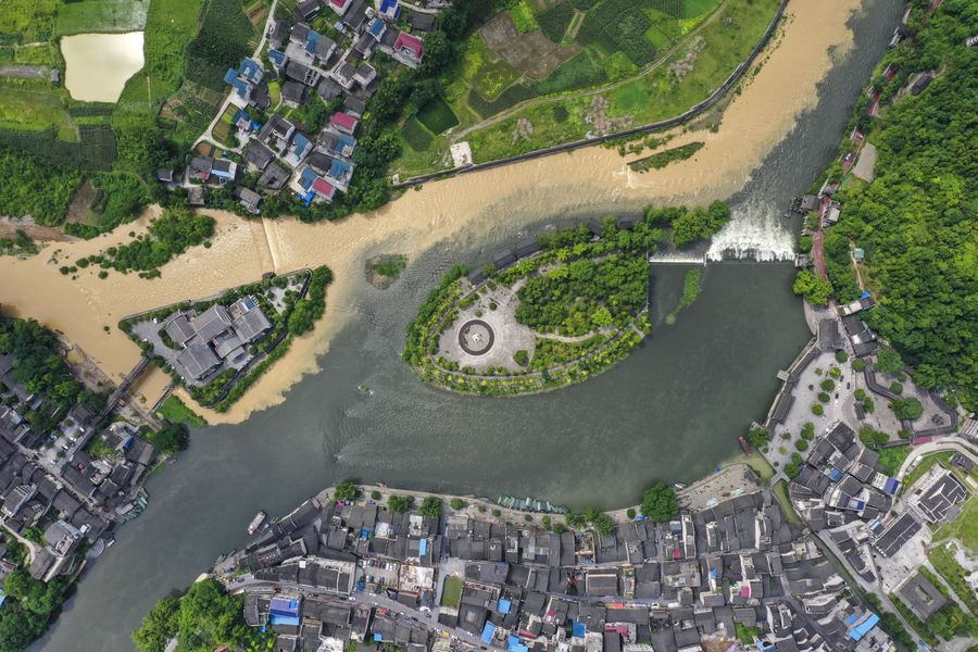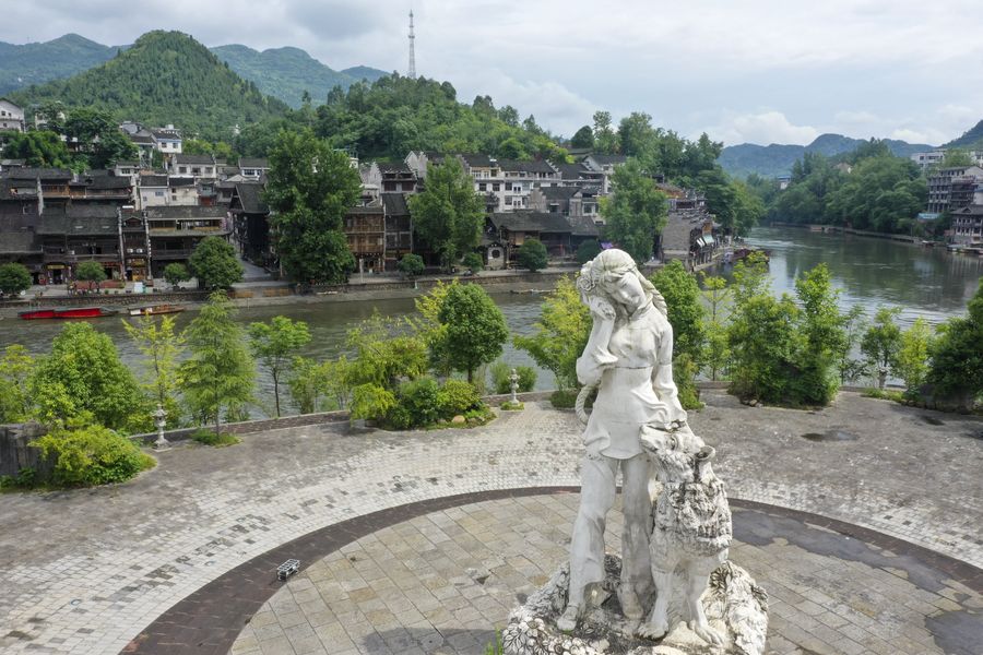 Aerial photo taken on July 18, 2019 shows the sculpture of Cuicui, a protagonist of "Border Town" written by Chinese author Shen Congwen, on the Qingshui River that separates Hongan Township of southwest China's Chongqing and Biancheng Township of central China's Hunan Province. (Xinhua/Liu Chan)