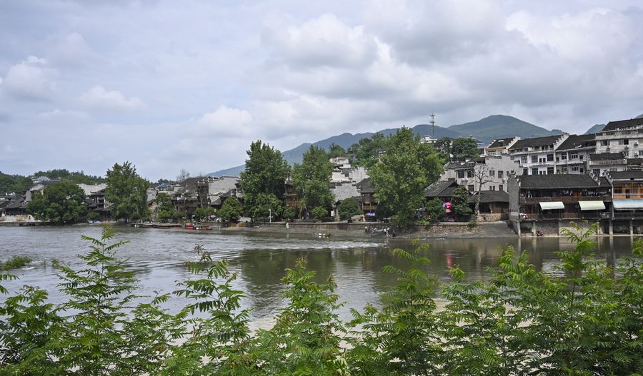 Photo taken on July 18, 2019 from a bridge in Hongan Township of southwest China's Chongqing shows scenery of Biancheng Township in Huayuan County, central China's Hunan Province. (Xinhua/Liu Chan)