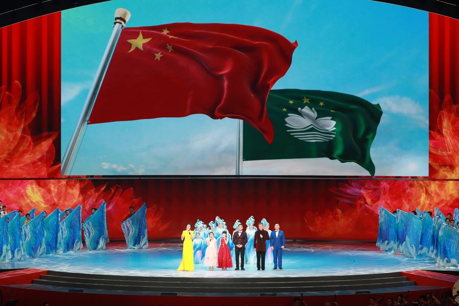 Artists perform during a grand gala in celebration of the 20th anniversary of Macao's return to the motherland in the Macao East Asian Games Dome, south China's Macao, Dec. 19, 2019. (Xinhua/Pang Xinglei)