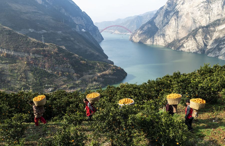 Villagers carry navel oranges at Lianziyan Village of Zigui County, central China's Hubei Province, Dec. 19, 2019. Since the beginning of winter, Zigui County has entered the navel orange harvest season. (Photo by Zheng Jiayu/Xinhua)
