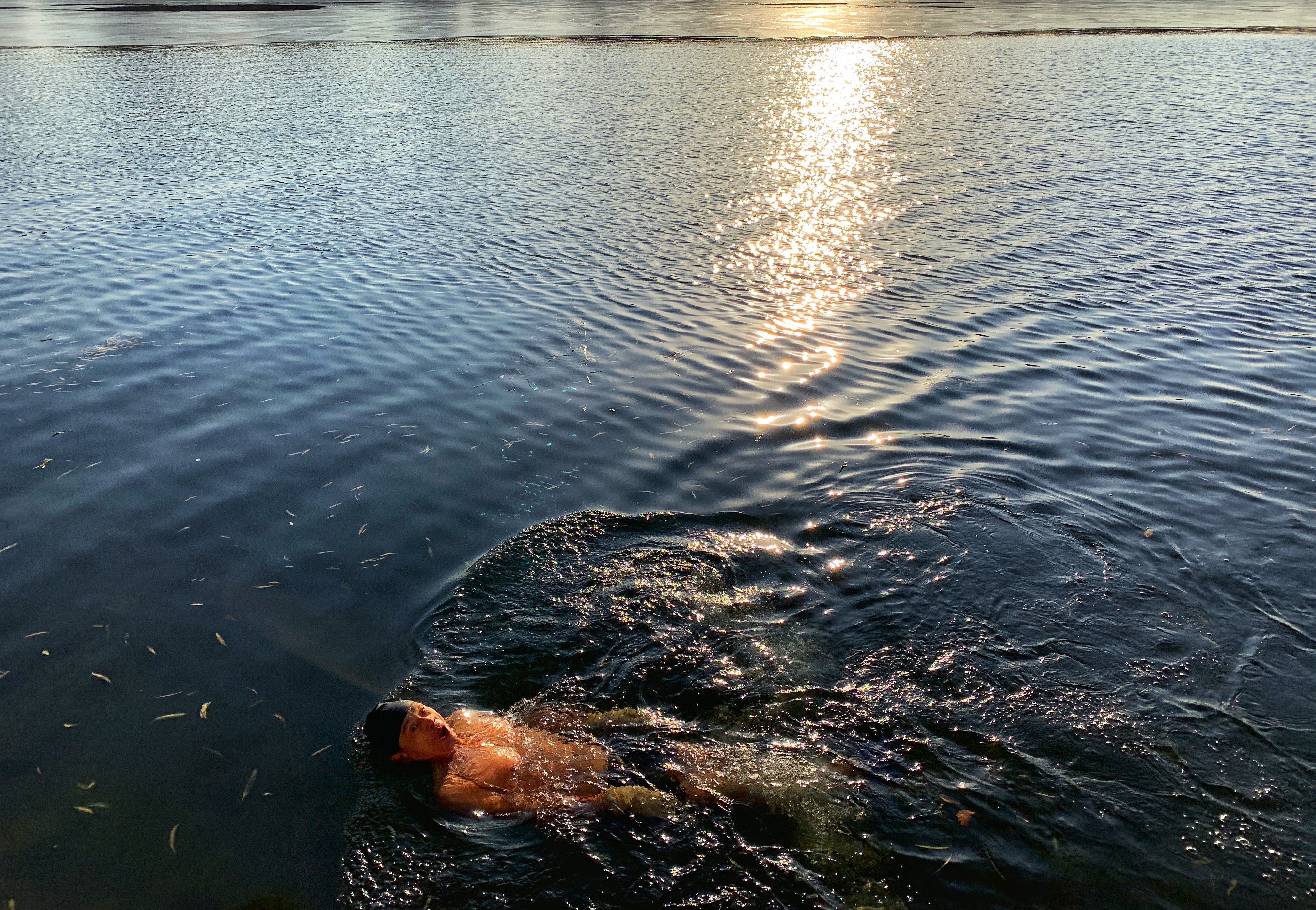 Mobile photo shows a man swimming in Houhai in Beijing, capital of China, Dec. 1, 2019. (Xinhua/Zhang Haofu)