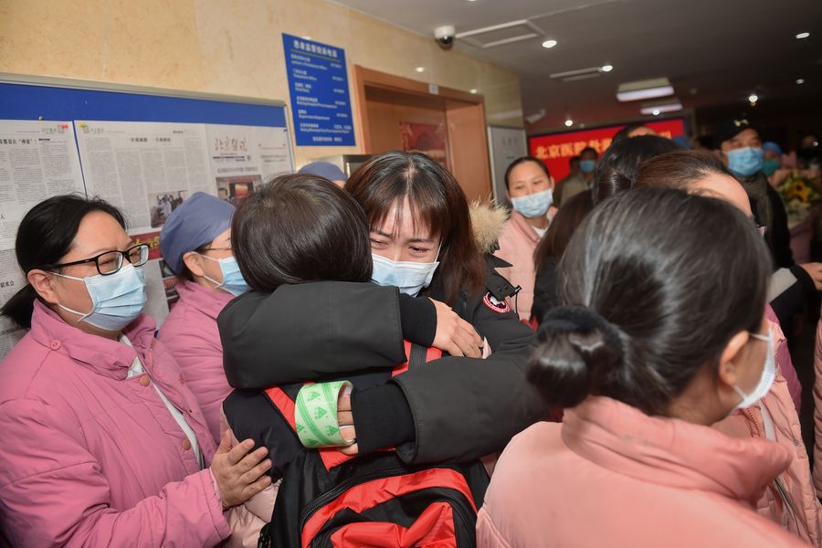 A member of a medical team (with red backpack) is hugged by a colleague at the Beijing Hospital in Beijing, capital of China, on Jan. 26, 2020. A 121-member medical team, organized by the National Health Commission, left Beijing for Wuhan Sunday afternoon to aid the coronavirus control efforts there. (Xinhua/Peng Ziyang)