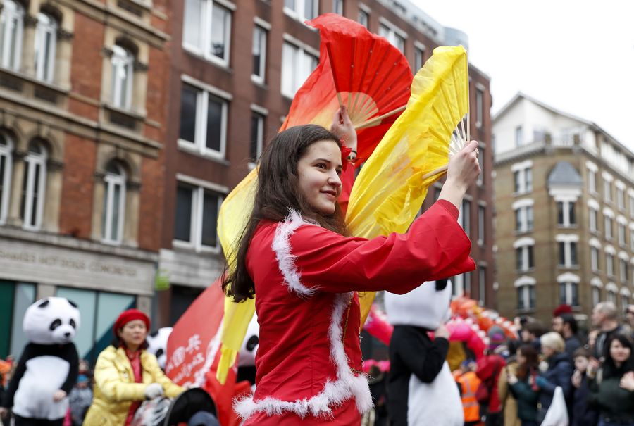 An artist performs to celebrate the Chinese Lunar New Year during an event in London, Britain, Jan. 26, 2020. (Xinhua/Han Yan)