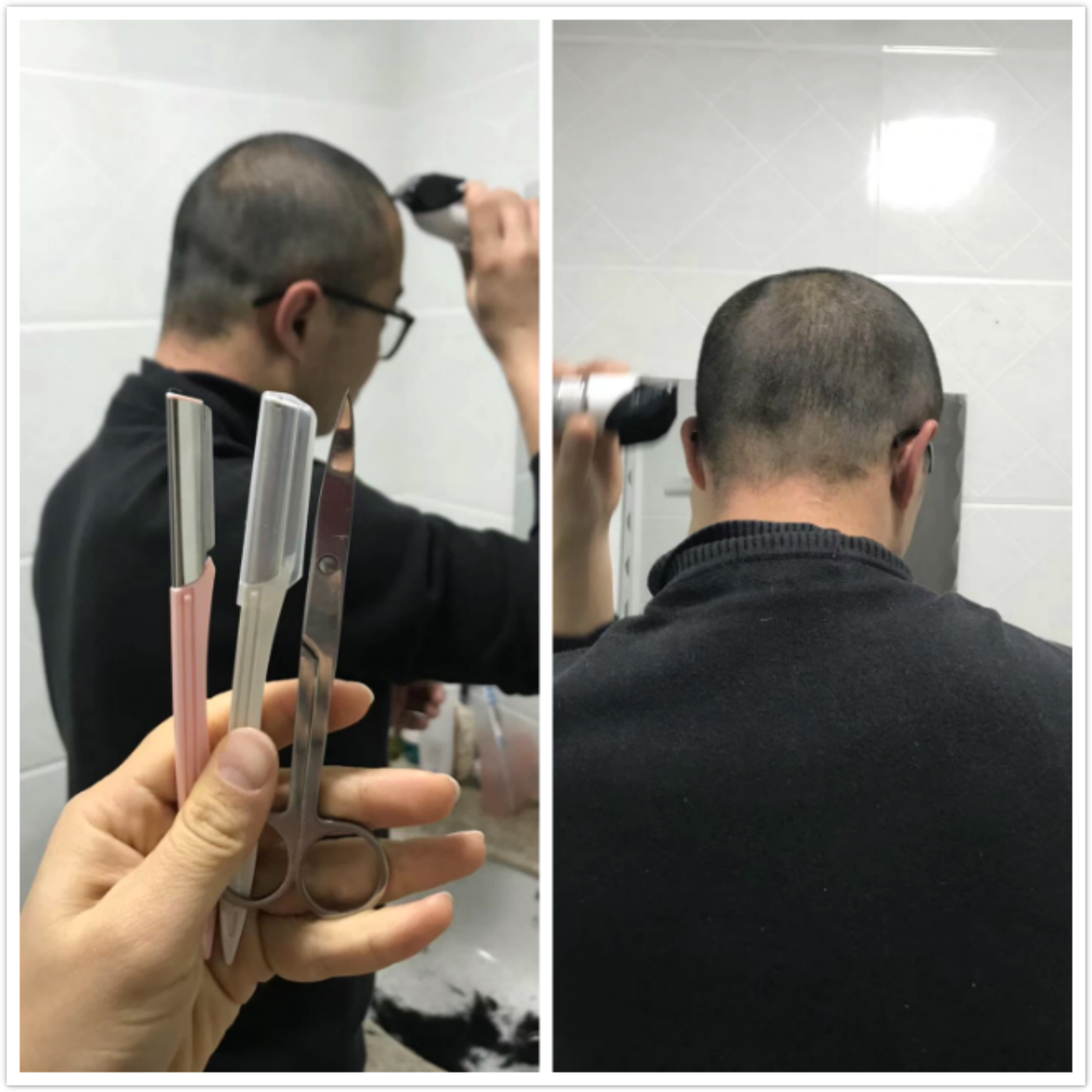 Zhou Jiaxiang, in the city of Ganzhou, gave himself a haircut with newly-purchased hair clippers. "The barbershop is still closed, and I haven't had my hair cut for over a month. So I decided to do it by myself. My wife further perfected the hairstyle with her eyebrow trimmer and we took a photo as a special memory," said Zhou.