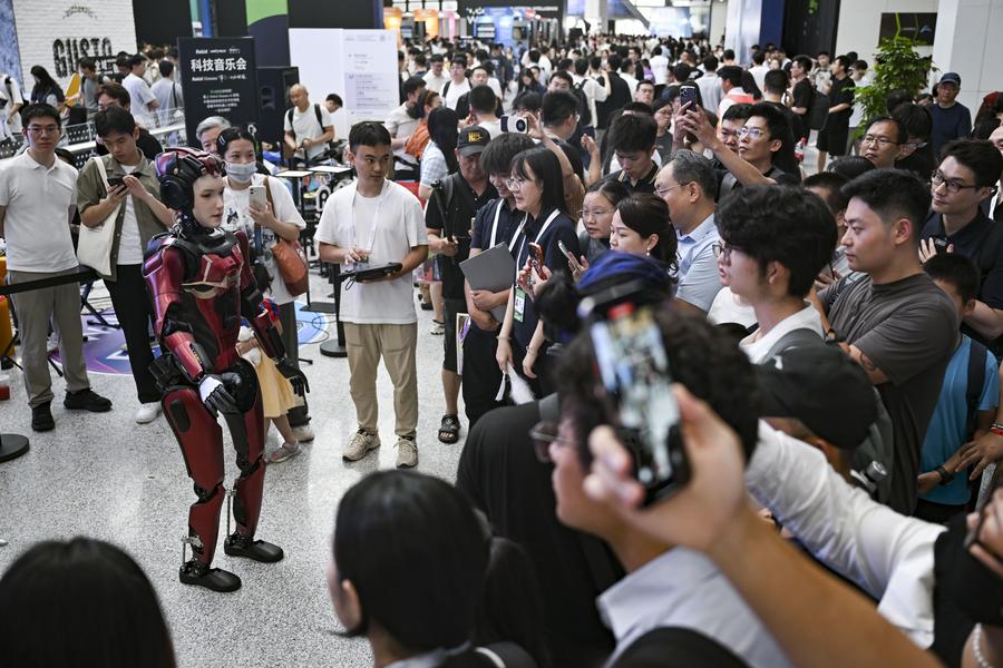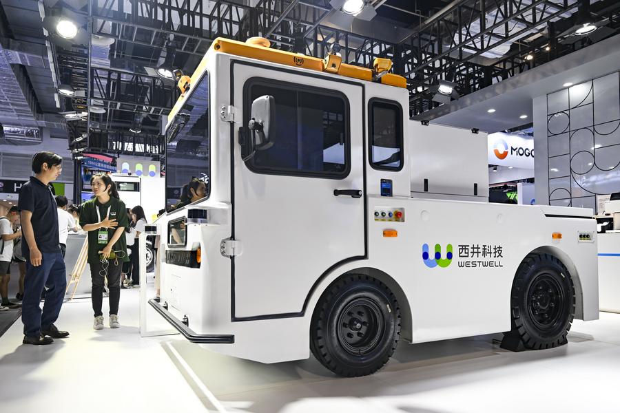 Visitors experience a ride in a next-generation intelligent cockpit system based on a large model by StepFun at the 2025 World AI Conference in east China's Shanghai, July 27, 2025. (Xinhua/Fang Zhe)China Mobile's self-developed robot dogs and humanoid robot dance at the company's booth during the 2025 World AI Conference in east China's Shanghai, July 27, 2025. (Xinhua/Chen Haoming)Humanoid robots serve popcorn and beverage at the 2025 World AI Conference in east China's Shanghai, July 27, 2025. (Xinhua/Fang Zhe)A visitor takes photos of a product at the booth of XtalPi during the 2025 World AI Conference in east China's Shanghai, July 27, 2025. (Xinhua/Chen Haoming)People visit a display of smart glasses at the 2025 World AI Conference in east China's Shanghai, July 27, 2025. (Xinhua/Fang Zhe)Visitors try the WPS Office AI system at the 2025 World AI Conference in east China's Shanghai, July 27, 2025. (Xinhua/Fang Zhe)A staff member of Tencent (L) introduces Tairos, an modular embodied intelligence open platform, to visitors at the 2025 World AI Conference in east China's Shanghai, July 27, 2025. (Xinhua/Chen Haoming)Visitors learn about a humanoid robot at the 2025 World AI Conference in east China's Shanghai, July 27, 2025. (Xinhua/Chen Haoming)A staff member (R) of Westwell, a Chinese technology company, introduces a Q-Tractor P40 Plus new energy unmanned vehicle to a visitor during its debut at the 2025 World AI Conference in east China's Shanghai, July 27, 2025. (Xinhua/Chen Haoming)