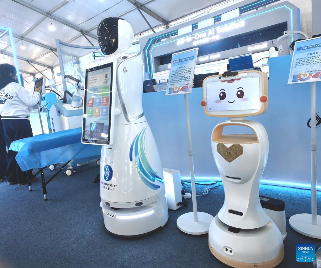 This photo shows an elderly care robot (1st R) during the 8th World Voice Expo in Hefei, the capital of east China's Anhui Province, Nov. 3, 2025. (Xinhua/Wang Haiyue)