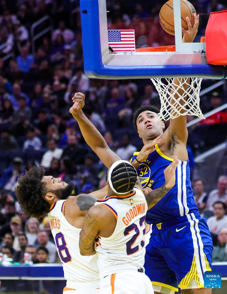 Moses Moody of Golden State Warriors vies for the ball during the 2025-2026 NBA regular season match between Phoenix Suns and Golden State Warriors in San Francisco, the United States, on Nov. 4, 2025. (Photo by Dong Xudong/Xinhua)