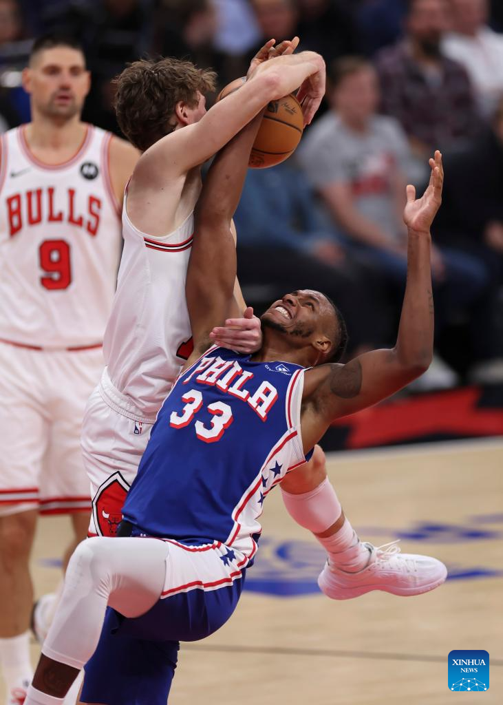 Philadelphia 76ers' Jabari Walker (bottom) grabs a rebound during the 2025-2026 NBA regular season match between Chicago Bulls and Philadelphia 76ers in Chicago, the United States, on Nov. 4, 2025. (Photo by Joel Lerner/Xinhua)