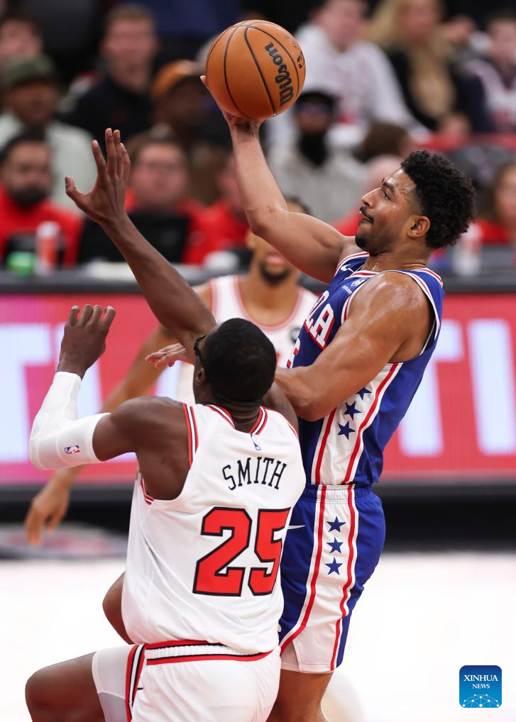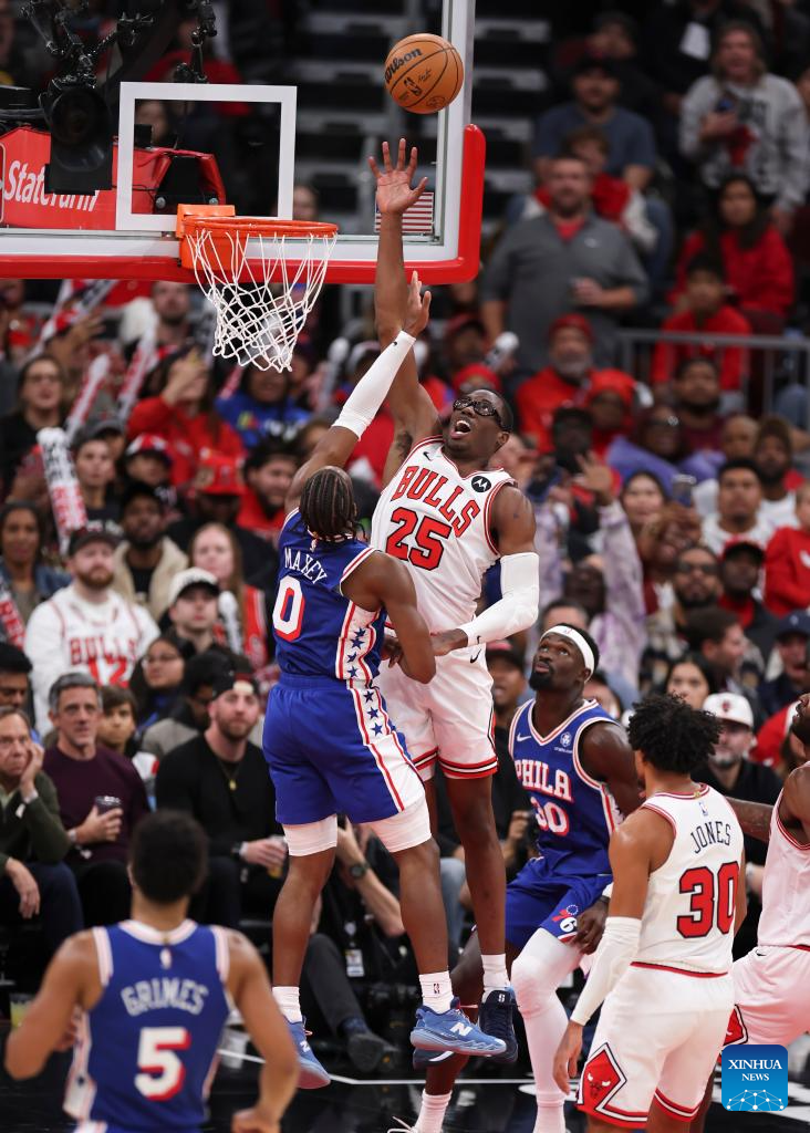 Chicago Bulls' Jalen Smith (top R) defends Philadelphia 76ers' Tyrese Maxey (top L) during the 2025-2026 NBA regular season match between Chicago Bulls and Philadelphia 76ers in Chicago, the United States, on Nov. 4, 2025. (Photo by Joel Lerner/Xinhua)